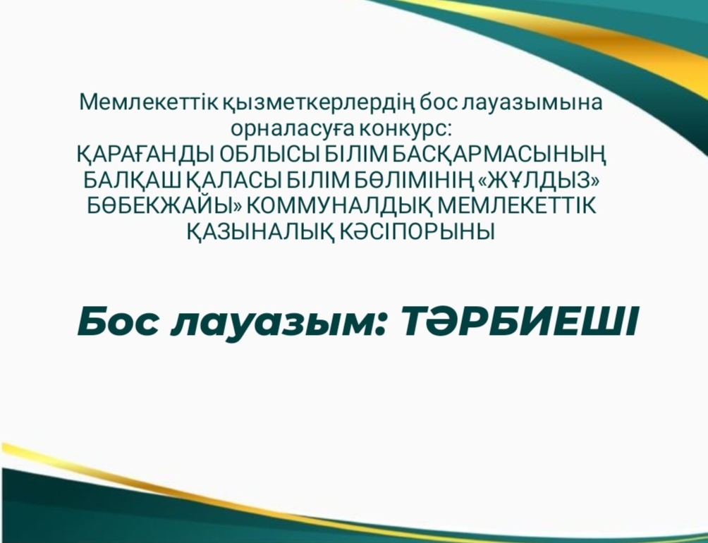 ВакансииКоммунальное государственное казённое предприятие «Ясли-сад «Жұлдыз» отдела образования города Балхаш управления образования Карагандинской области объявляет конкурс на вакантную должность воспитателя. |
