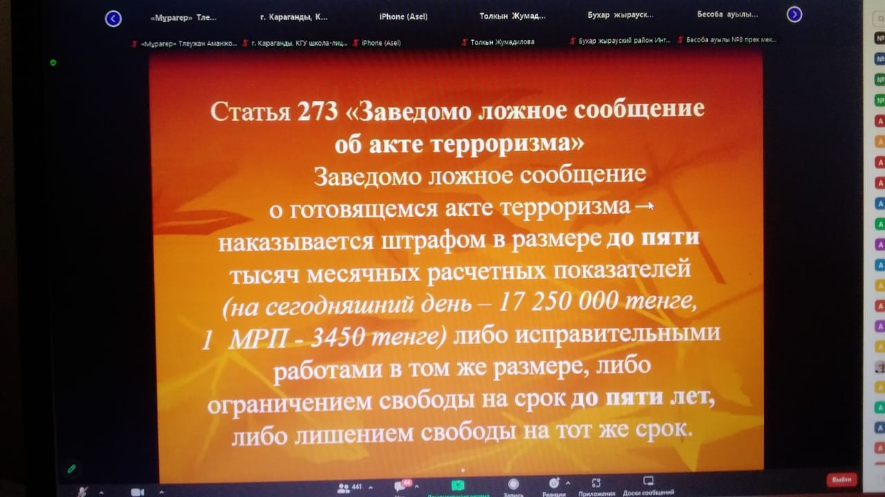 родительское собрание 19.01.2319.01.23 г в онлайн режиме состоялось региональное родительское собрание, организованное руководителем областного управления образования. На родительском собрании присутствовали попечительский совет, совет матерей и отцов. Всего было 86 родителей. На повестке дня: 1 об административной ответственности несовершеннолетних и родителей за совершение правонарушений и преступлений- выступает судья межрайонного суда по делам несовершеннолетних Карагандинской области Искакбаев Кенжебай Дарбаевич. 2 ложные вызовы об акта терроризма и ответственности за них- выступает майор полиции старший инспектор Управления местной полицейской службы Департамента полиции Карагандинской области Омарова Асель Бахытжановна . 3 новые виды синтетических наркотиков. Профилактика употребления и распространения - начальник отдела по борьбе с нарко преступностью ДВД Карагандинской области , полковник полиции Бузук Александр Владимирович. |