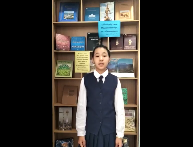 " Оқуға қуштар мектеп"Участие в Челлендже "Республикам менің" ко дню Республики в рамках проекта " Оқуға қуштар мектеп". Ученик 7 "В" класса мараткызы Улдана. |