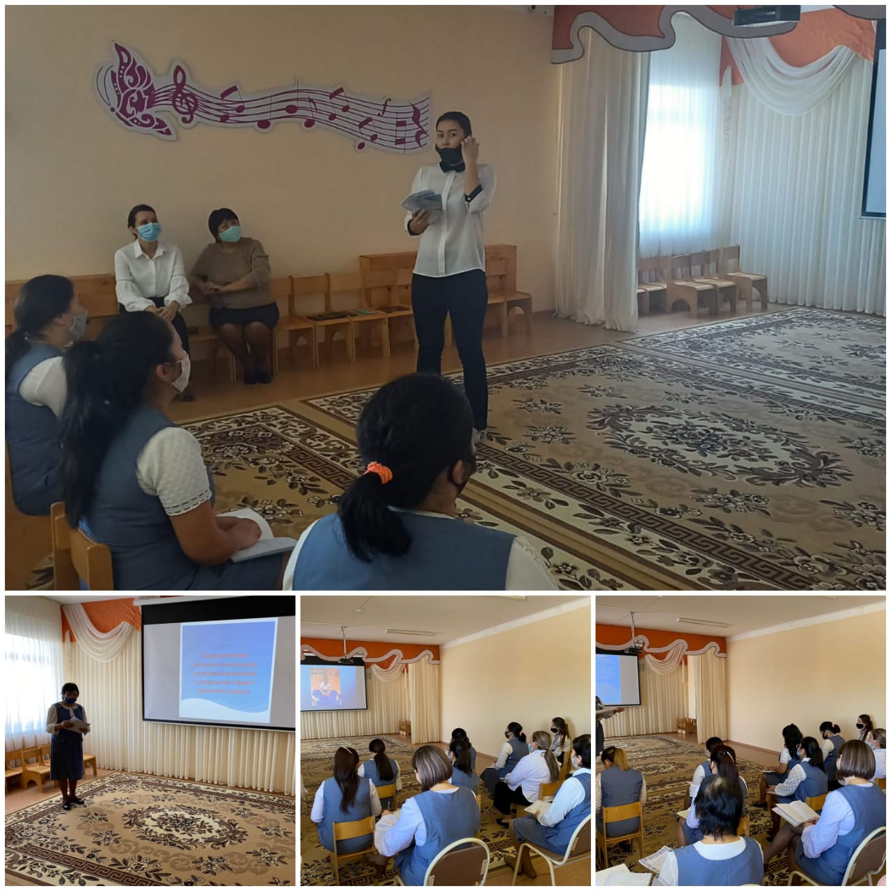 Педагогический совет прошел в ясли-саду «Балақай» в форме педагогического обмена опытом.Педагогический совет прошел в ясли-саду «Балақай» в форме педагогического обмена опытом. Педагог казахского языка Уайденова Н.М поделилась опытом по патриотическому воспитанию дошкольников через ознакомление с народными обычаями и традициями казахского народа. Мухаметжанова Н.Т поделилась с опытом в использование игротерапии в организационной учебной деятельности при нарушениях звукопроизношения дошкольников» Сапаргалиева Г.С изучала и делилась знаниями в системе индивидуальных занятий по развитию внимания дошкольников, как основа формирования познавательной компетентности» Аширбекова Р.С рассказывала об экспериментальной деятельности, как средство воспитания экологической культуры детей старшего дошкольного возраста Физ.инструкторы продемонстрировали игровые дыхательные упражнения в ОУД по физической культуре с использованием дыхательных тренажёров и раздали буклеты по возрастным группам. |