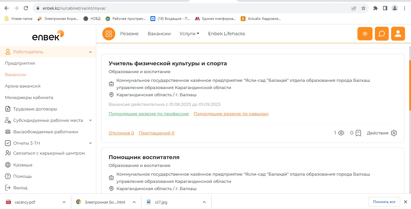 вакансииҚарағанды облысы білім басқармасының Балқаш қаласы білім бөлімінің «Балақай» бөбекжайы» коммуналдық мемлекеттік қазыналық кәсіпорыны қазақ тіліндегі оқу орнында тәрбиеші бос лауазымына конкурс жариялайды 1 Білім беру ұйымының атауы Қарағанды облысы білім басқармасының Балқаш қаласы білім бөлімінің «Балақай» бөбекжайы» коммуналдық мемлекеттік қазыналық кәсіпорыны мекенжайы, пошталық мекенжайы индекс 100300, Қарағанды облысы, Балқаш қаласы, Сәкен Сейфуллин көшесі, ғимарат №73 телефон нөмірлері индекс 100300, Қарағанды облысы, Балқаш қаласы, Сәкен Сейфуллин көшесі, ғимарат №73 электрондық пошта мекенжайлары индекс 100300, Қарағанды облысы, Балқаш қаласы, Сәкен Сейфуллин көшесі, ғимарат №73 2 Бос немесе уақытша бос лауазымның атауы, жүктемесі Тәрбиеші 2 негізгі функционалдық міндеттері Лауазымдық міндеттері. Балалардың денсаулығын сақтау мен қорғау қызметін қамтамасыз етеді: оларды оқыту мен тәрбие беруде денсаулық сақтайтын технологияларды қолданады. Мектепке дейінгі тәрбие мен оқытудың мемлекеттік жалпыға міндетті стандартының талабына, жас ерекшелік топтарының үлгілік оқыту жоспары бойынша оқу қызметінің кестесіне сәйкес педагогикалық процесті жүзеге асырады, пәндік-дамытушылық ортанын қалыптастырады, балалардың шығармашылығына (ойындық, танымдық, қозғалыс, көркемөнер, еңбекке баулу) жетекшілік етеді. Балалармен жұмыс істеу кезінде жекелей және бағыттық әдісін іске асырады. Дамуында ауытқу байқалатын балалармен түзеу қызметі саласында еңбек ететін мамандармен бірлесе жұмыс жасайды, жалпы білім беретін оқу бағдарламаларын, оқу-әдістемелік әдебиеттерді зерделеу негізінде және топтағы балалардың жеке талаптарын ескере отырып тәрбие-білім беру жұмыстарын жоспарлайды. Тәрбиелеу мен оқыту қызметін қол жеткен жетістіктерді қорытындылай отырып жоспарлайды. Мүмкіндіктері шектеулі балалар мен қалыпты жағдайда дамып келе жатқан балалардың мектеп жасына жеткенде мүмкіндіктерінің тең дәрежеде болуын қамтамасыз ету үшін бірге тәрбиелеу және оқыту арқылы оларды әлеуметтендіруді жүзеге асырады. Мамандардың ұсынымдарын ескере отырып, мүмкіндігі шектеулі әрбір баламен жеке жұмыс жүргізеді. Отандық және шетелдік ғылыми-зерттеу жұмыстарының, авторлық шығармалардың негізінде педагогикалық қызметтің жаңа бағыттарын зерделеумен және оны жұмыс барысында қолданумен шұғылданады. Мектепке дейінгі балаларды тәрбиелеу және оқыту барысында ата-аналарға консультативтік көмек беруді іске асырады. Балалардың құқықтары мен мүдделерін қорғайды. Білім беру ұйымдарында "Құндылықтарға негізделген білім беру" тұжырымдамасын білім беру процесінде барлық нысандар, оның ішінде балалар отбасыларының қатысуымен енгізеді. Білуге міндетті: • Қазақстан Республикасының Конституциясын, Қазақстан Республикасының Еңбек Кодексін, Қазақстан Республикасының "Білім туралы", "Педагог мәртебесі туралы", "Сыбайлас жемқорлыққа қарсы күрес туралы" заңдары және білім беруді дамытудың бағыттары мен перспективаларын айқындайтын Қазақстан Республикасының өзге де нормативтік құқықтық актілерін; • психология және педагогика, алғашқы медициналық көмек көрсету ережелерін, еңбекті қорғау және қауіпсіздік техникасын, санитарлық ережелерді; • мектепке дейінгі тәрбие мен оқытуды ұйымдастырудың нормативтік-құқықтық құжаттарын. Білік