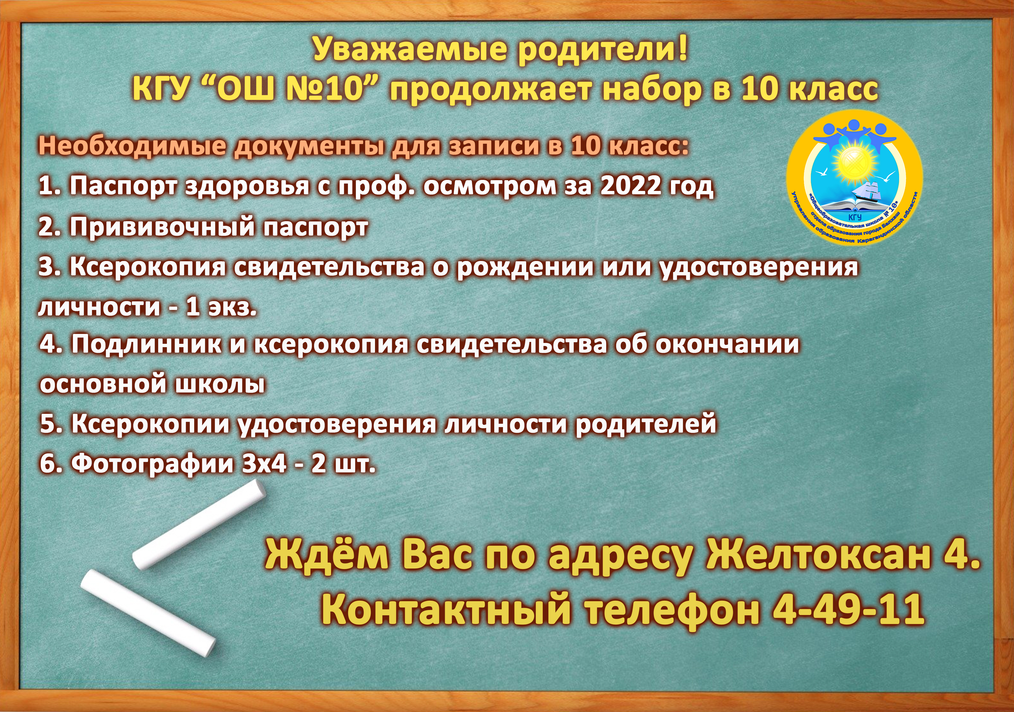 Уважаемые родители! КГУ “ОШ №10” продолжает набор в 1 класс до 31 июля 2022 года