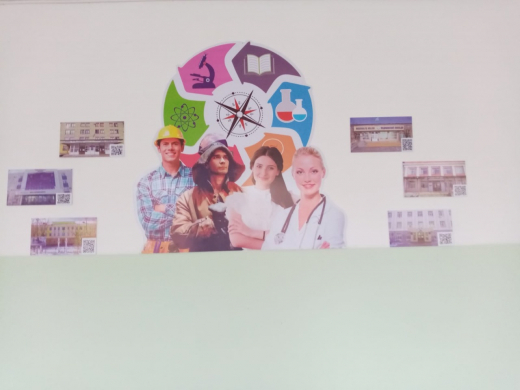 В 2020 году началось оформление рекреации профориентационной направленности. 2 марта 2022 года, в день смотра кабинетов был презентован новый стенд о колледжах города. На фотографиях колледжей имеется qr код, с помощью сотового телефона можно получить информацию об учебном заведении. Сам кабинет профориентации оснащен техническими средствами: ноутбуками, интерактивной доской. В центральной части кабинета расположен стенд «Сто дорог- одна твоя!» с материалами по профориентации, среди них информация Центра занятости г. Балхаш о профессиях, которые нужны городу. Работая по проекту «Профессии моих родных», учащиеся начальных классов вместе со своими родными подготовили фотоколлажи, а учащиеся 5-6 классов коллажи по теме «Моя будущая профессия».9-11 классы работали над созданием коллажей по теме «История профессии». В кабинете есть, так называемые «говорящие парты». В первом ряду на партах размещены разделители с материалом о профессиях, которые необходимы в г. Балхаш. На втором и третьем ряду – разделители рассказывают о профессиях, которые нужны Казахстану в 2022 году. В течение учебного года все классы ведут «Портфолио» по самоопределению, которое также находится в кабинете профориентации. Кабинет оснащен ноутбуками, интерактивной доской. Любой ученик, желающий узнать о своих способностях и наклонностях, пройдя тестирование, получит рекомендации о профессиях, которые ему подходят. А с помощью виртуального гида, можно посмотреть видео и узнать все об учебных заведениях Балхаша и Караганды.