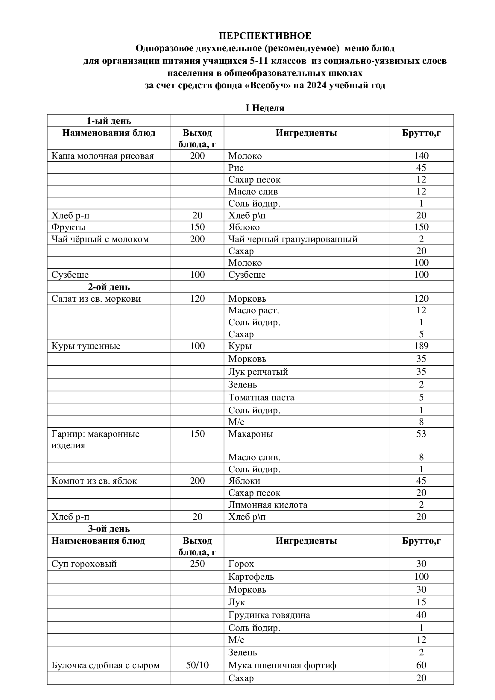 ПЕРСПЕКТИВНОЕ Одноразовое двухнедельное (рекомендуемое) меню блюд для организации питания учащихся 5-11 классов из социально-уязвимых слоев населения в общеобразовательных школах за счет средств фонда «Всеобуч» на 2024 учебный год