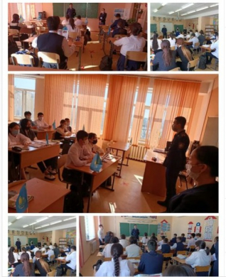 16.02.2022 г. в целях профилактики правонарушений среди подростков участковый инспектор полиции группы ювенальной полиции Нурбек Аян Алтайулы провел лекцию для учащихся 9-11 классов на тему: «Профилактика правонарушений-главная задача».