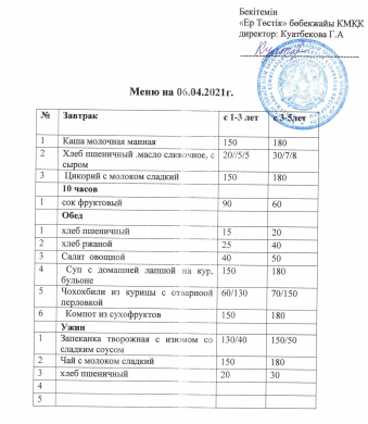 Сегодня 12.04.2021 году стоимость питания в КГКП "Ясли - сад"Ер Төстік" составила для детей до 3 лет 445тг, для детей от 3до 6 лет 575,3 тг.