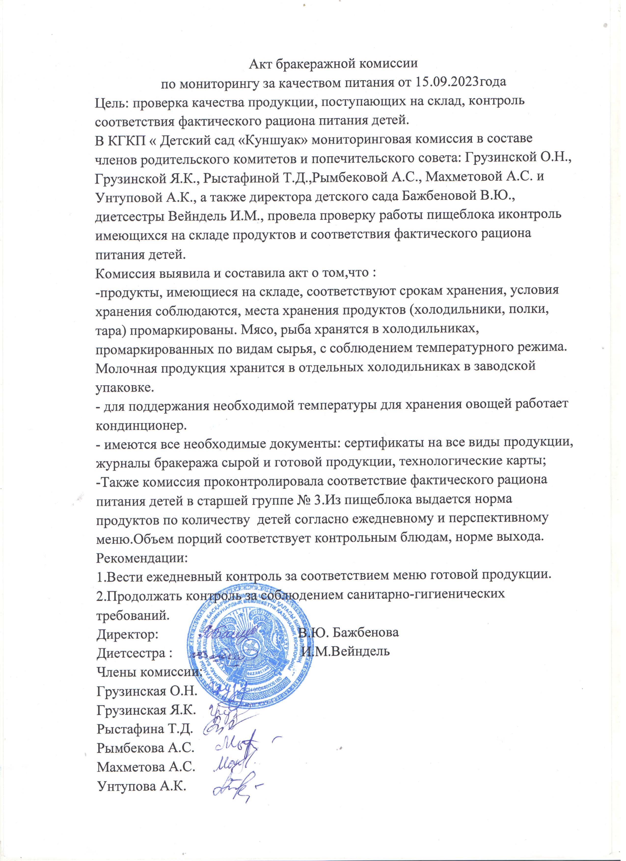 Акт бракеражной комиссии по мониторингу за качеством питания от 15.09.2023 года. |