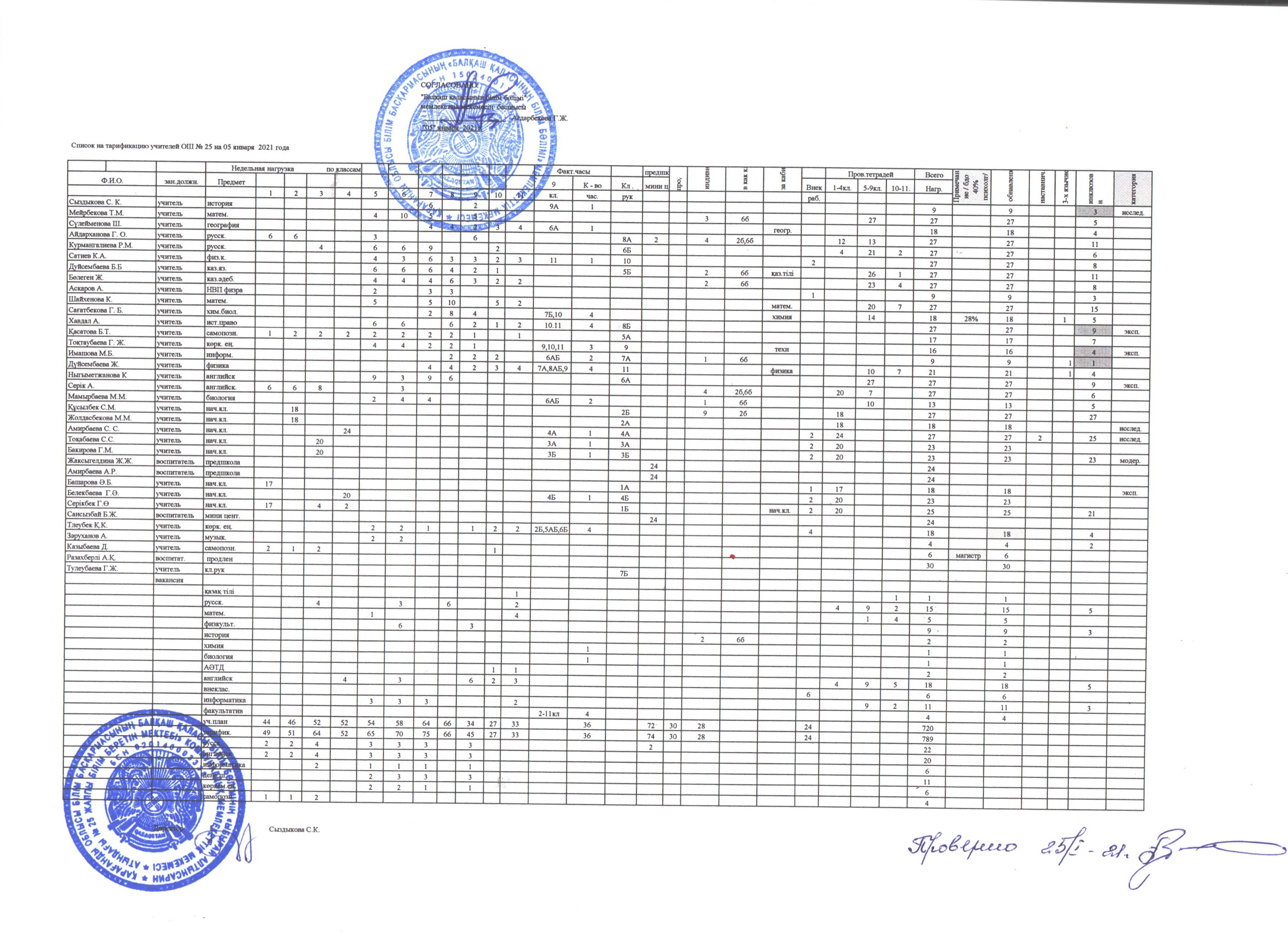 Список на тарификацию учителей ОШ№25 на 25 января 2021 года