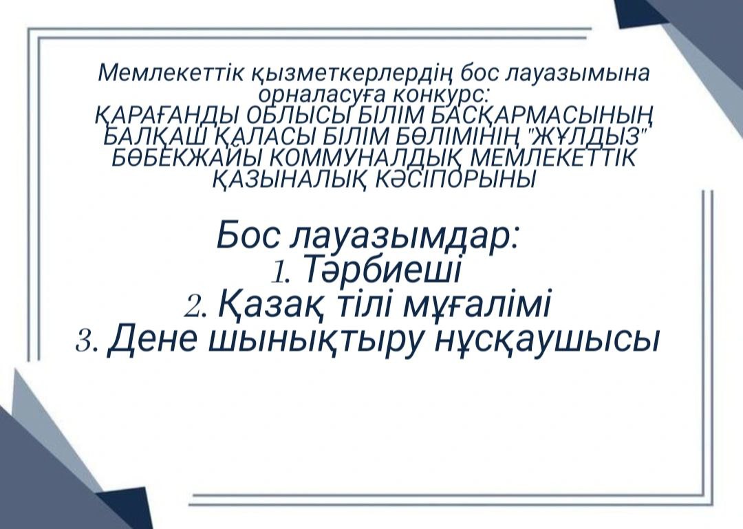 Қарағанды облысы білім басқармасының Балқаш қаласы білім бөлімінің «Жұлдыз» бөбекжайы» коммуналдық мемлекеттік қазыналық кәсіпорыны қазақ тіліндегі оқу орнында балабақшадағы тәрбиеші бос лауазымына конкурс жариялайды.