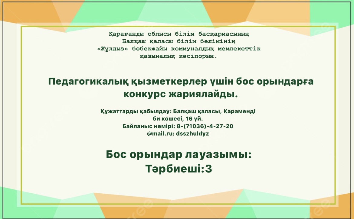 ВакансииКоммунальное государственное казённое предприятие «Ясли-сад «Жұлдыз» отдела образования города Балхаш управления образования Карагандинской области объявляет конкурс на вакантную должность воспитателя. |