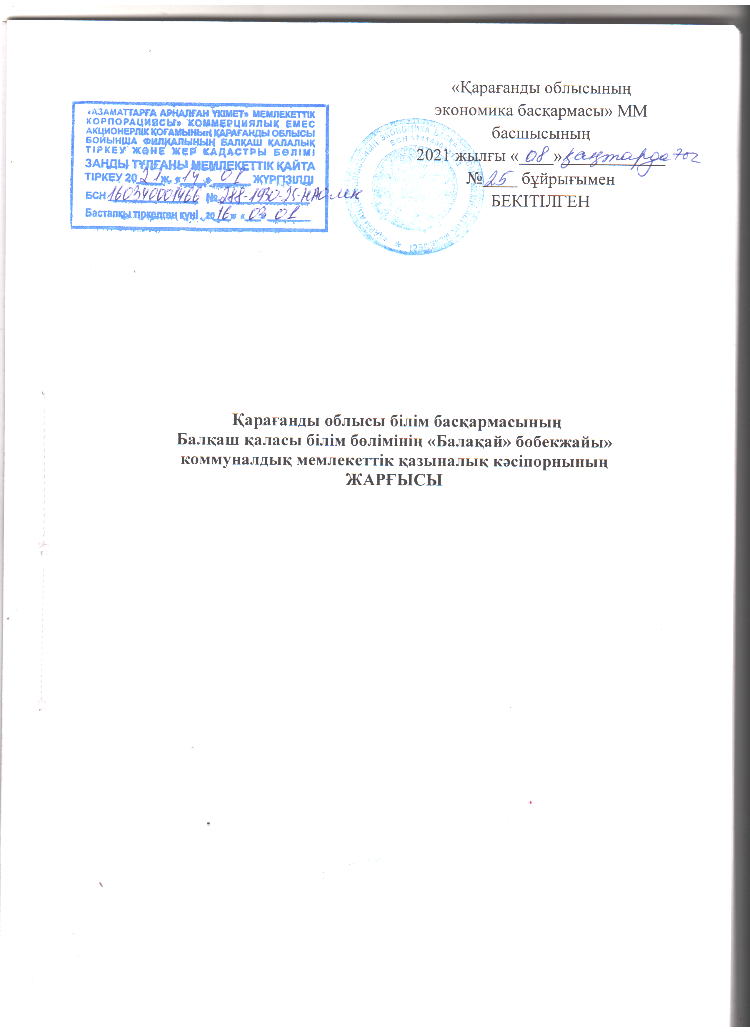 УСТАВ ясли сада на гос.языке1 бөлім. Жалпы ережелер 1. Қарағанды облысы білім басқармасының Балқаш қаласы білім бөлімінің «Балақай» бөбекжайы» коммуналдық мемлекеттік қазыналық кәсіпорынының (бұдан әрі - Кәсіпорын) жедел басқару негізінде мемлекеттік кәсіпорынының ұйымдық-құқықтық нысанындағы заңды тұлға болып табылады. 2. Кәсіпорын облыстың жергілікті атқарушы органының шешімімен құрылады. 3. Кәсіпорынның құрылтайшысы - Қарағанды облысының әкімдігі. 4. Кәсіпорын мүлкіне қатысты мемлекеттік коммуналдық субъектінің құқықтары «Қарағанды облысының экономика басқармасы» мемлекеттік мекемесімен жүзеге асырылады. 5. Кәсіпорынның басқару органы Қарағанды облысының білім басқармасының «Балқаш қаласының білім бөлімі» мемлекеттік мекемесі болып табылады. 6. Кәсіпорынның мемлекеттік (қазақ) тілдегі атауы: Қарағанды облысы білім басқармасының Балқаш қаласы білім бөлімінің «Балақай» бөбекжайы» коммуналдық мемлекеттік қазыналық кәсіпорыны. Орыс тілінде: Коммунальное государственное казённое предприятие «Ясли-сад «Балақай» отдела образования города Балхаш управления образования Карагандинской области. 7. Кәсіпорынның орналасқан жері: индекс 100300, Қарағанды облысы, Балқаш қаласы, Сәкен Сейфуллин көшесі, ғимарат №73. 2 бөлім. Кәсіпорынның құқықтық мәртебесі 8. Кәсіпорынның дербес балансы, заңға сәйкес банктік шоттары, фирмалық бланкілері, Қазақстан Республикасының Мемлекеттік елтаңбасы және Кәсіпорынның атауы жазылған мөрі бар. 9. Қазақстан Республикасының заңдарында көзделген жағдайларды қоспағанда, кәсіпорын заңды тұлғаларды құра алмайды, сондай-ақ басқа заңды тұлғаның құрылтайшысы (қатысушысы) бола алмайды. 10. Кәсіпорын Қазақстан Республикасының заңнамасына сәйкес филиалдар мен өкілдіктер құра алады. 11. Кәсіпорын жасасқан және Қазақстан Республикасының заңнамалық актілеріне сәйкес міндетті мемлекеттік немесе өзге тіркеуге жататын азаматтық-құқықтық мәмілелер, егер Қазақстан Республикасының заң актілерінде өзгеше көзделмесе, тіркелген кезден бастап аяқталған болып саналады. 3 бөлім. Кәсіпорын қызметтігінің мәні мен міндеттері 12. Кәсіпорынның пәні - бір жастан алты жасқа дейінгі үздіксіз мектепке дейінгі білім беруді қамтамасыз ететін білім беру мекемесінің оңтайлы моделін әзірлеу және енгізу, оның мақсаты - әрбір тәрбиеленушінің оқыту субъектісі ретінде ерекше даралық ретінде дамуына ықпал ету. 13. Кәсіпорын қызметінің мақсаты мектепке дейінгі тәрбие мен оқытудың жалпы білім беретін бағдарламалары бойынша білім беру қызметін жүзеге асыру болып табылады. Кәсіпорынның негізгі міндеттері: 1) мектеп жасына дейінгі балалардың физикалық және психикалық денсаулығын сақтау және нығайту, оларды салауатты өмір салтының құндылықтарымен таныстыру; 2) мектеп жасына дейінгі балалардың интеллектуалды және жеке дамуын қамтамасыз ету, олардың қызығушылықтарын қанағаттандыру, жалпыадамзаттық және ұлттық құндылықтармен танысу негізінде қабілеттерін дамыту; 3) бастамашылықты, қызығушылықты, озбырлықты және мектеп жасына дейінгі балалардың шығармашылық өзін-өзі көрсете білу қабілетін дамыту; 4) балалардың мектепке дейінгі тәрбие мен оқытудың білім беру бағдарламаларын игеруіне жағдай жасау; 5) мектепке дейінгі сапалы дайындықты қамтамасыз ету; 6) азаматтыққа, қазақстандық патриотизмге, адамның құқықтары мен бостанд