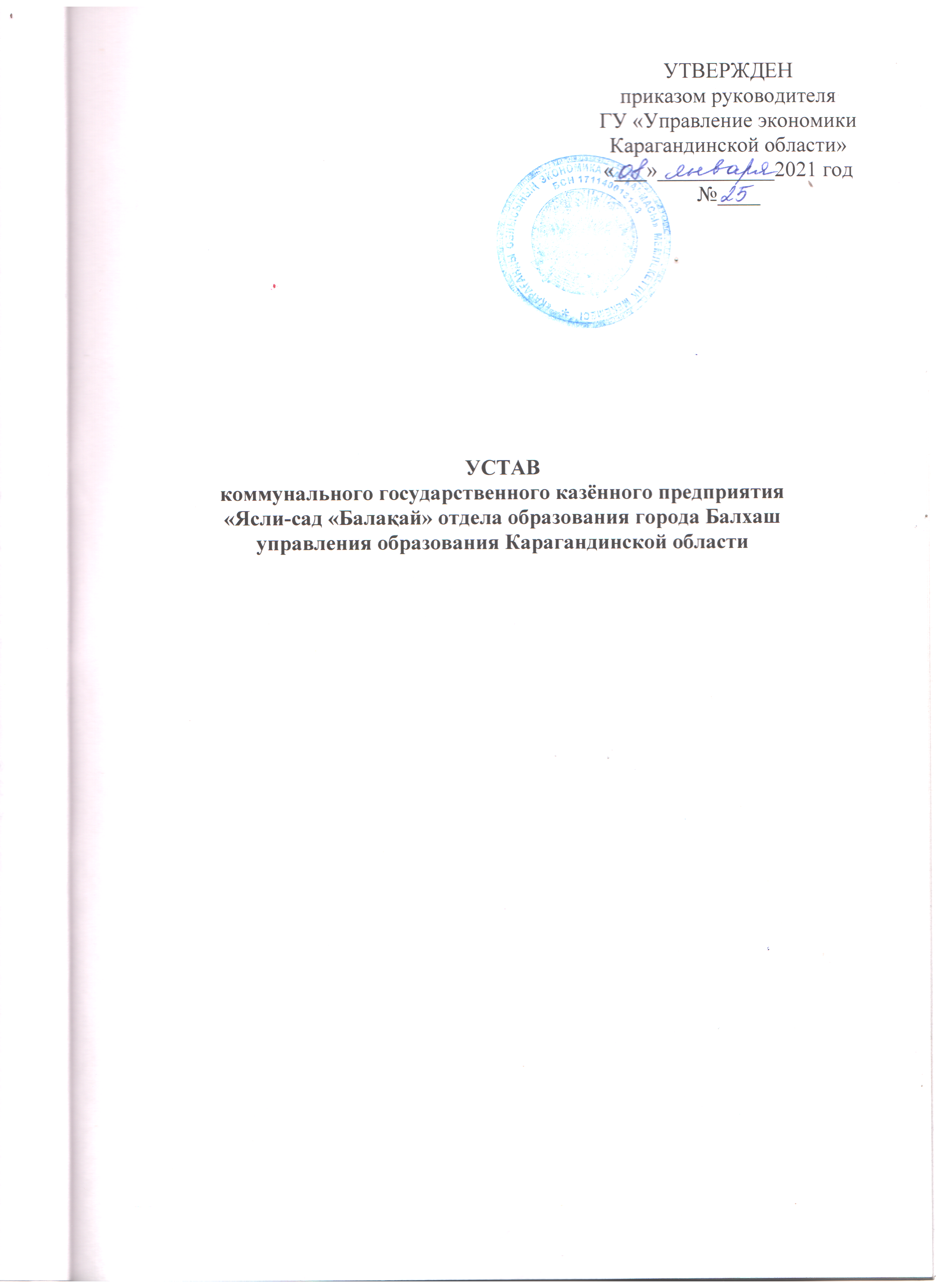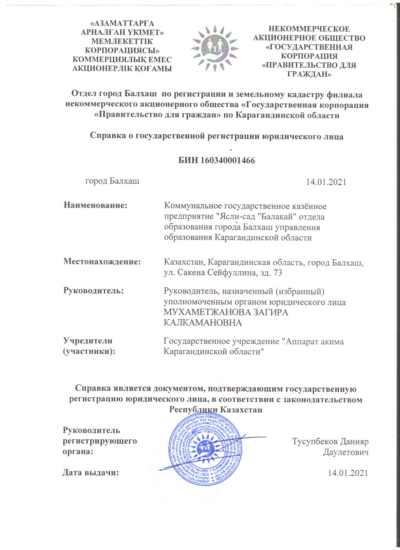 Устав ясли сада на русском языкеГлава 1. Общие положения 1. Коммунальное государственное казённое предприятие «Ясли-сад «Балақай» отдела образования города Балхаш управления образования Карагандинской области (далее - Предприятие) является юридическим лицом в организационно - правовой форме государственного предприятия на праве оперативного управления. 2. Предприятие создается решением местного исполнительного органа области. 3. Учредителем Предприятия является акимат Карагандинской области. 4. Права субъекта права государственной коммунальной собственности в отношении имущества Предприятия осуществляет государственное учреждение «Управление экономики Карагандинской области». 5. Органом, осуществляющим управление Предприятием является государственное учреждение «Отдел образования города Балхаш» управления образования Карагандинской области. 6. Наименование Предприятия: на государственном (казахском) языке: Қарағанды облысы білім басқармасының Балқаш қаласы білім бөлімінің «Балақай» бөбекжайы» коммуналдық мемлекеттік қазыналық кәсіпорыны ; на русском языке: Коммунальное государственное казённое предприятие «Ясли-сад «Балақай» отдела образования города Балхаш управления образования Карагандинской области. 7. Место нахождения предприятия: индекс 100300, область Карагандинская, город Балхаш, улица Сакена Сейфуллина, здание №73. Глава 2. Юридический статус Предприятия 8. Предприятие имеет самостоятельный баланс, счета в банках в соответствии с законодательством, бланки, печать с изображением Государственного Герба Республики Казахстан и наименованием Предприятия. 9. Предприятие не может создавать юридические лица, а также выступать учредителем (участником) другого юридического лица, за исключением случаев, предусмотренных законами Республики Казахстан. 10. Предприятие может создавать филиалы и представительства в соответствии с законодательством Республики Казахстан. 11. Гражданско-правовые сделки, заключаемые Предприятием и подлежащие обязательной государственной или иной регистрации в соответствии с законодательными актами Республики Казахстан, считаются совершенными с момента регистрации, если иное не предусмотрено законодательными актами Республики Казахстан. Глава 3. Предмет и цели деятельности Предприятия 12. Предметом деятельности Предприятия является разработка и внедрение оптимальной модели образовательного учреждения, дающего непрерывное дошкольное образование от одного года до приема в первый класс, целью которого является содействие развитию каждого воспитанника, как неповторимой индивидуальности, как субъекта учения. 13. Целью деятельности Предприятия является осуществление образовательной деятельности по общеобразовательным программам дошкольного воспитания и обучения. Основными задачами Предприятия являются: 1) охрана и укрепление физического и психического здоровья детей дошкольного возраста, приобщение их к ценностям здорового образа жизни; 2) обеспечение интеллектуального и личностного развития детей дошкольного возраста, удовлетворение их интересов, развитие способностей на основе приобщения к общечеловеческим и национальным ценностям; 3) развитие инициативности, любознательности, произвольности и способности к творческому самовыражению детей дошкольного во