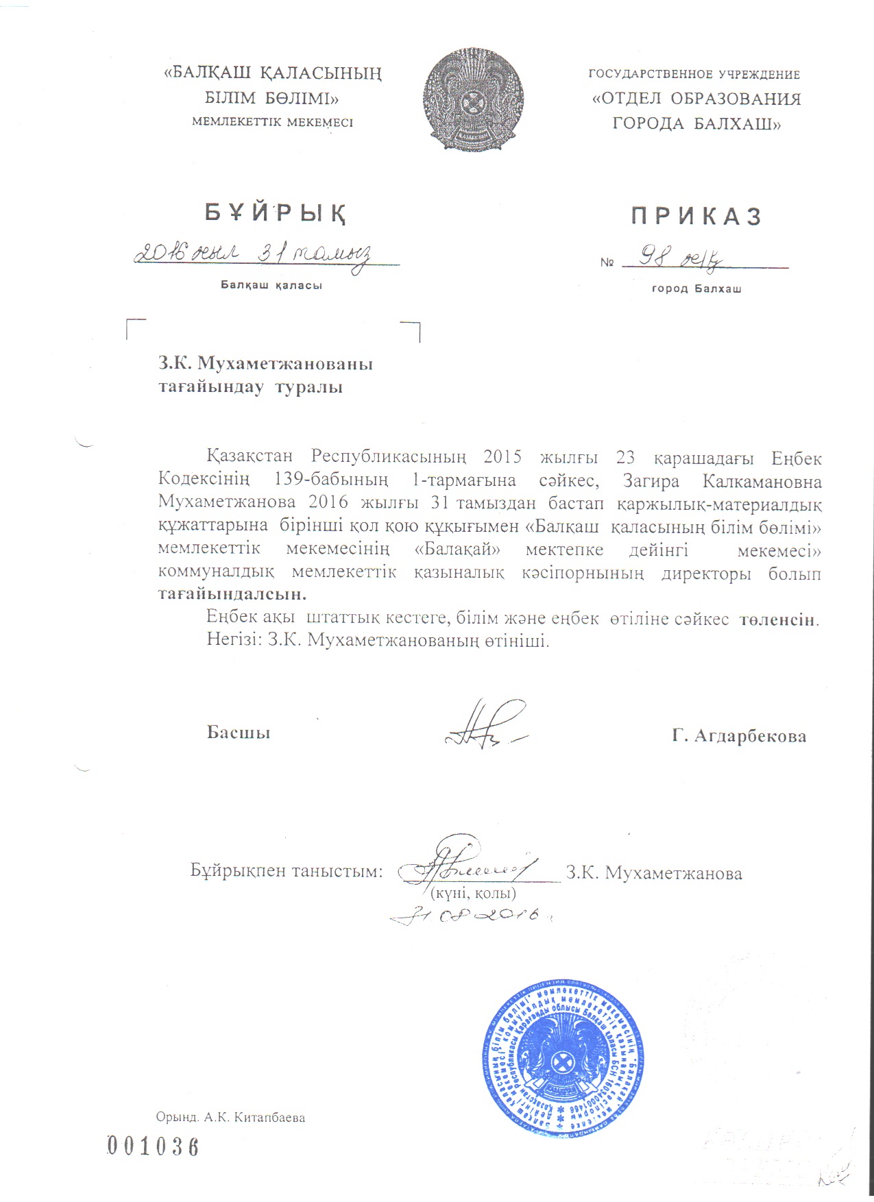 Приказ о назначении заведующейПриказ о назначении заведующей |